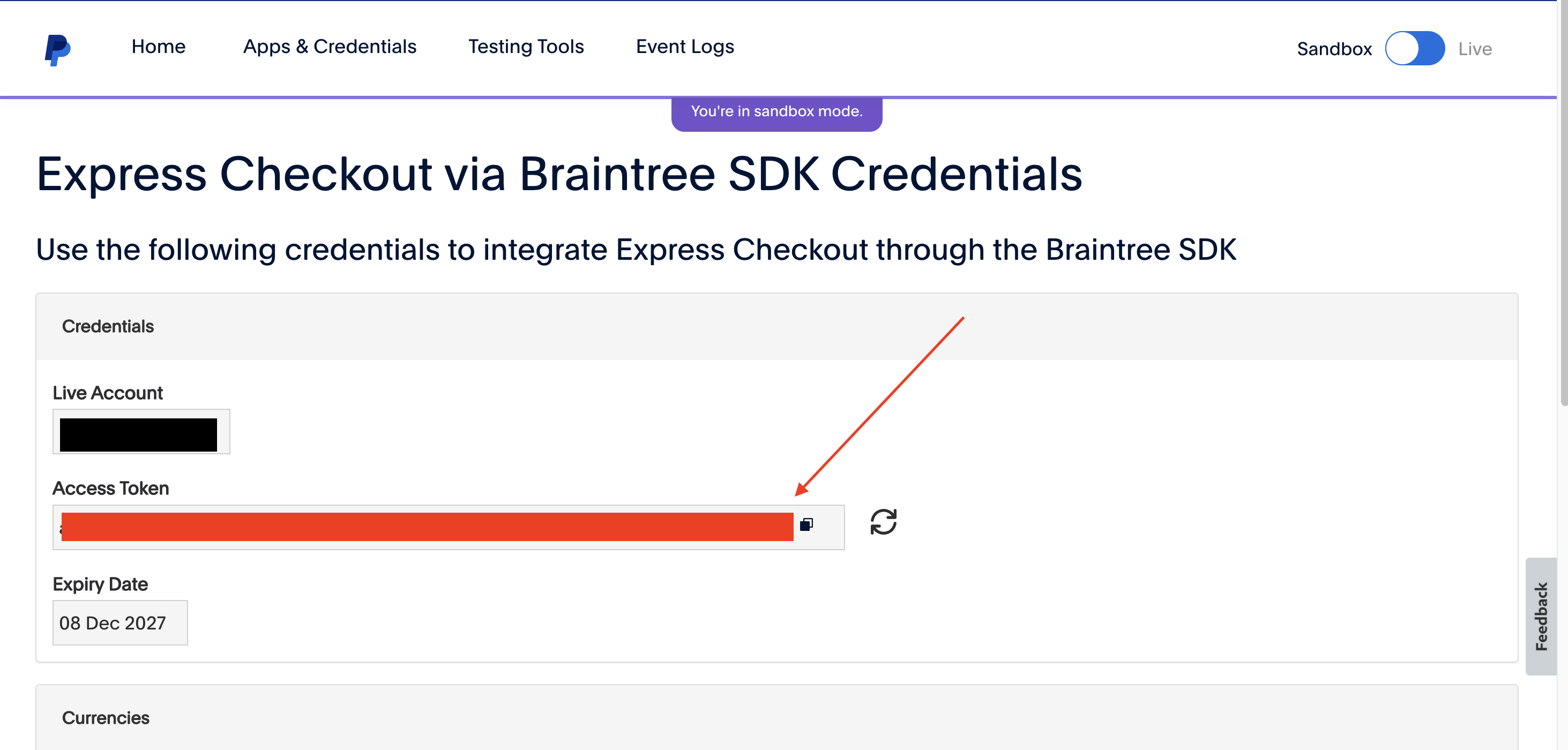 To find your PayPal access token, navigate to https://developer.paypal.com/ and login using your regular Paypal login details.