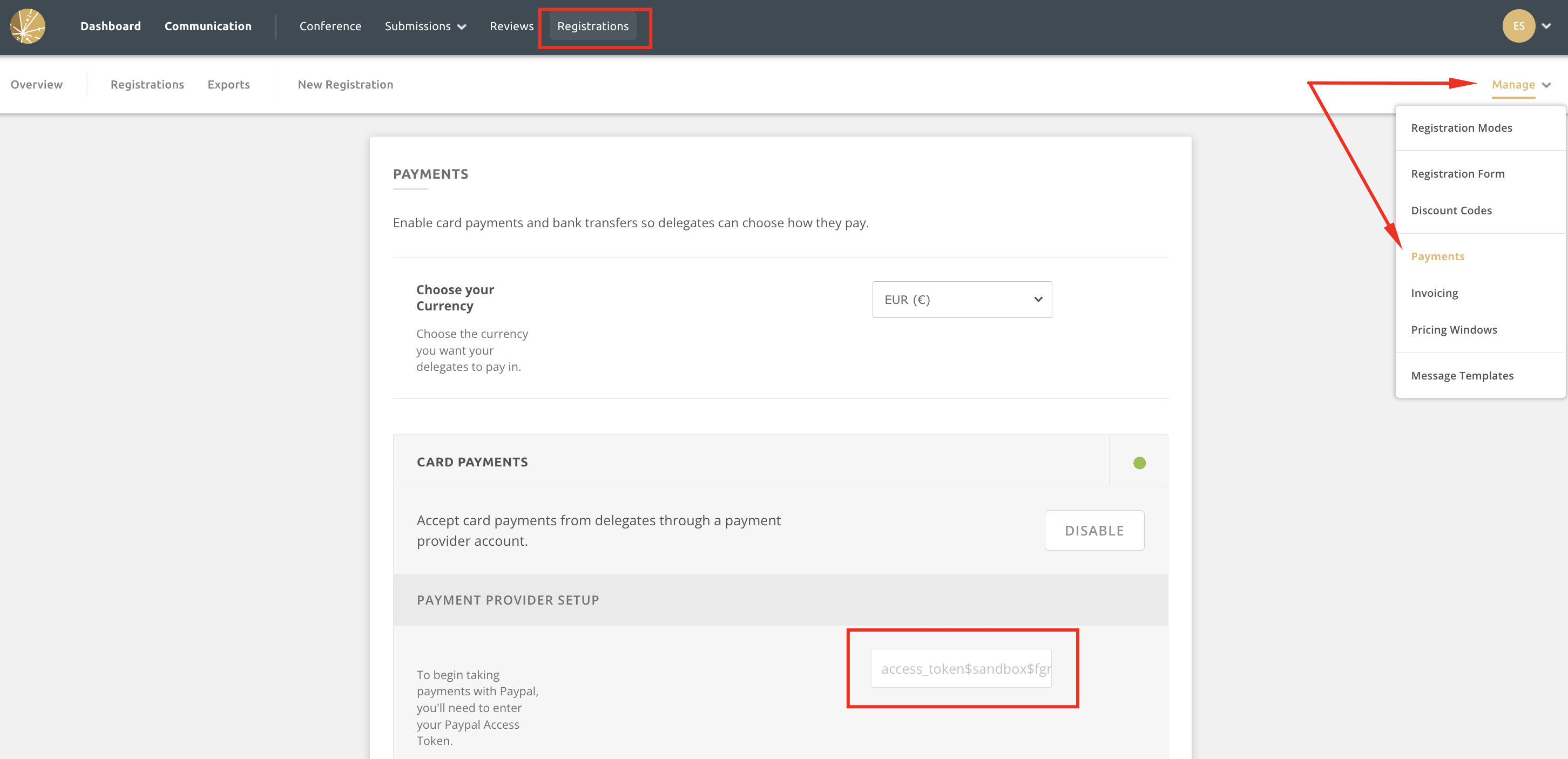 To start accepting payments through your PayPal account, you need to first find your PayPal access token and enter it in your Payments setting in registration. Follow the below steps to find this access token and allow your delegates to pay with PayPal.